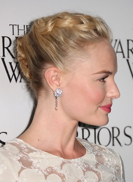 This updo looks complicated, but it's worth all the fuss. To get this classy Kate Bosworth look, start by braiding your hair back into a French braid at an angle. When you have reached the back, gather your hair up into a French twist. Pair it with a delicate earring for even more elegance.